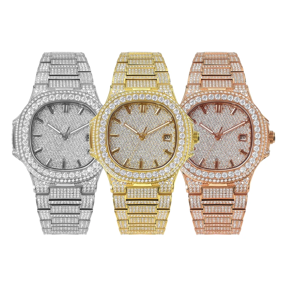 Perfect for hip hop fashion, luxury streetwear, nightlife, or anyone with a love for bold accessories, this watch blends craftsmanship with a high-end aesthetic. The iced-out bezel, case, and bracelet create a high-impact shine that catches every angle of light—making it a true showstopper.